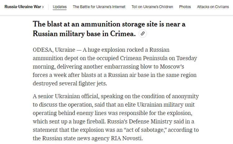 Издание также упомянуло в своей статье недавнее заявление советника главы ОП Михаила Подоляка, в котором тот намекнул на причастность Украины. Заявление являлось ответом на публикацию главы ОП Андрея Ермака в Telegram, в котором тот писал, что вооруженные силы страны продолжат "демилитаризацию", и на заявление Минобороны РФ о диверсии.