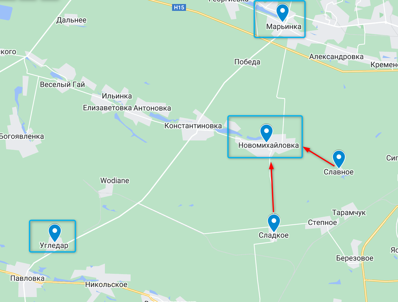 Этот населенный пункт вчера также атаковали с востока, от Славного. Захват Новомихайловки позволил бы развить наступление на Марьинку с юга. Либо же ударить с севера на Угледар.