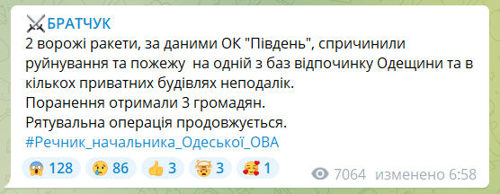 По его словам, две ракеты привели к разрушениям и пожарам на базе отдыха и в нескольких частных домах. Пострадали три человека.