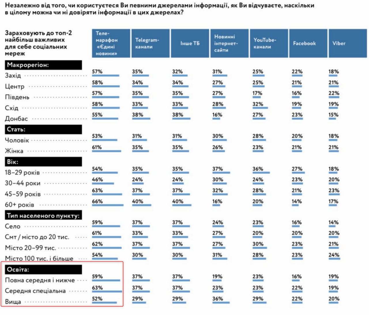 Так, респонденты-школьники доверяют "Единым новостям" на 59%. Те, у кого средне-специальное образование - на 63%, а те, у кого высшее - на 52%.