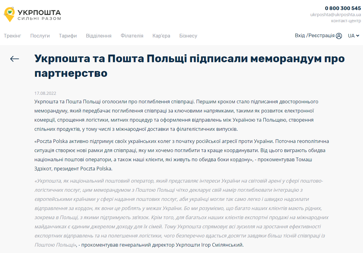 "Укрпочта" и почтовый оператор Польши Poczta Polska ускорят пересылки между странами и снизят тарифы на услуги в рамках сотрудничества двух компаний.