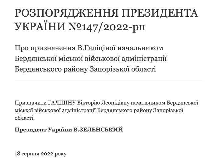 Также Зеленский своим распоряжением назначил руководителя Бердянской военной администрации. Им стала Виктория Галицина.