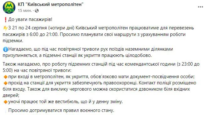 Метро в Киеве с 21 по 24 августа будет закрываться на час раньше - в 21:00.