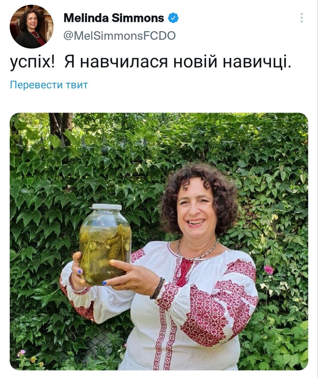 10.28 Посол Великобритании Мелинда Симмонс осваивает кулинарные традиции Украины. Она научилась мариновать огурцы, чем и похвасталась в твиттере.