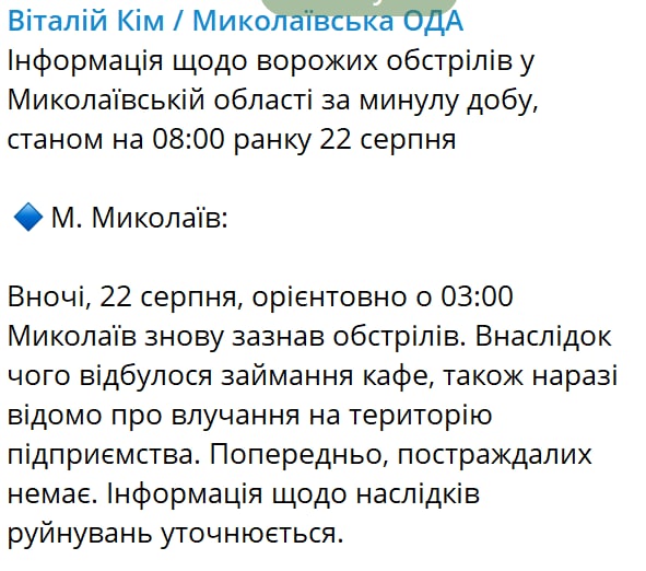 08:44 Около трех часов ночи Николаев подвергся обстрелам, сообщил губернатор Виталий Ким.