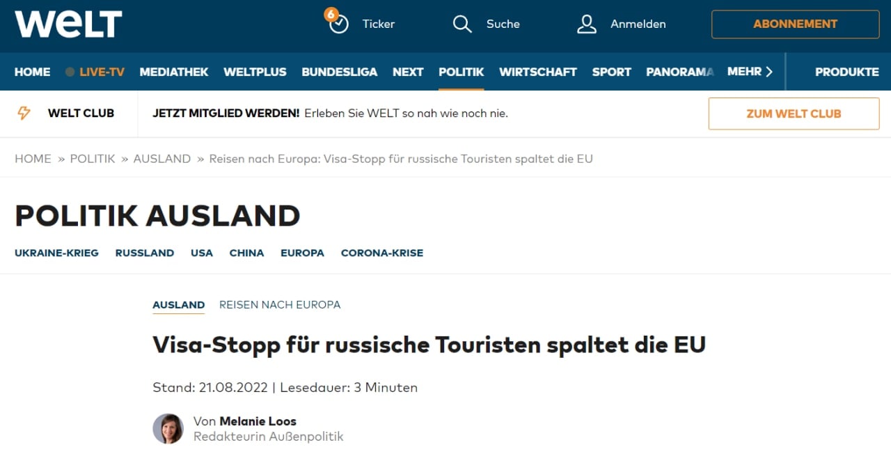 10:52 Ограничение виз для туристов из РФ "раскололо ЕС", пишет Die Welt.