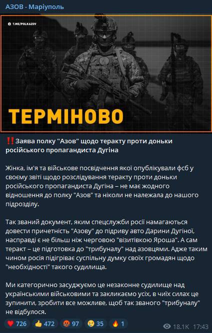 Ранее советник главы ОП Михаил Подоляк заявил, что Дарью Дугину убили приближенные к власти РФ политические группировки, которые хотели бы вызвать эскалацию войны с Украиной.