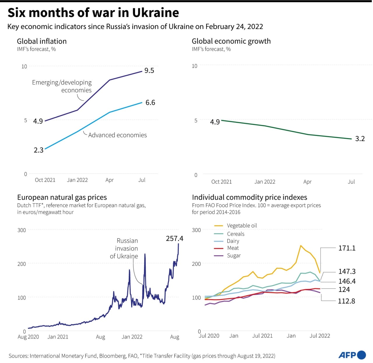 Судя по инфографике AFP, инфляция выросла примерно вдвое для развивающихся стран и почти втрое - для развитых. Прогнозный рост глобальной экономики упал с 4,9% до 3,2%.