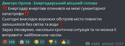Тем временем мэр Энергодара Дмитрий Орлов сообщает, что в оккупированном городе из-за обстрелов исчезла свет и вода. В обстрелах он обвиняет россиян.