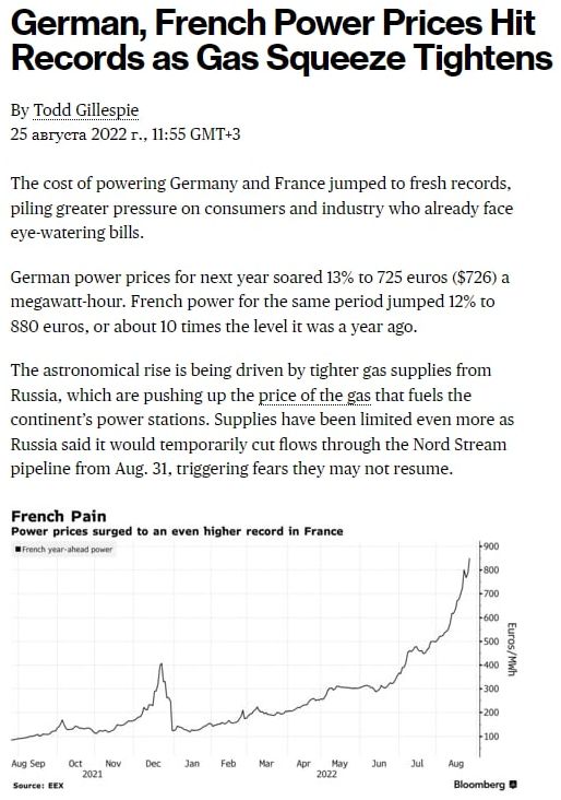 Цены на электроэнергию в Германии и Франции бьют рекорды. Так, стоимость электроэнергии в Германии выросла на 13% до 725 евро за мегаватт-час. Французская электроэнергия за тот же период подорожала на 12% до 880 евро, что примерно в 10 раз превышает уровень годичной давности, сообщает Bloomberg.