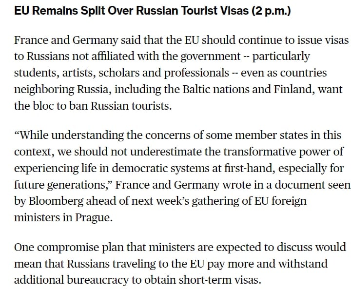 Франция и Германия предложат ЕС не прекращать выдачу виз россиянам, но брать с них больше денег - Bloomberg