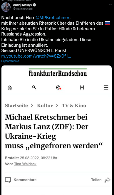 Посол Украины в Германии Андрей Мельник, который с октября завершит работу в этой должности, заявил об отмене приглашения посетить Украину земельному премьеру Саксонии Михаэлю Кречмеру после его призывов добиваться перемирия в войне РФ против Украины.