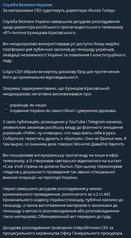 Служба безопасности Украины (СБУ) завершила досудебное расследование в отношении директора "RT" Антона Кузнецова-Красовского.