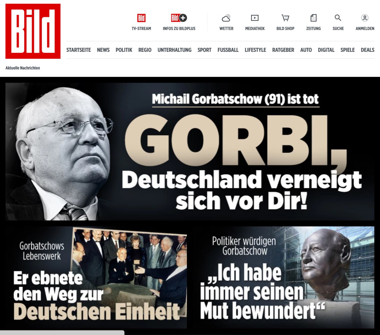 Bild: "Он проложил путь к немецкому единству", "Горби, Германия кланяется тебе!"