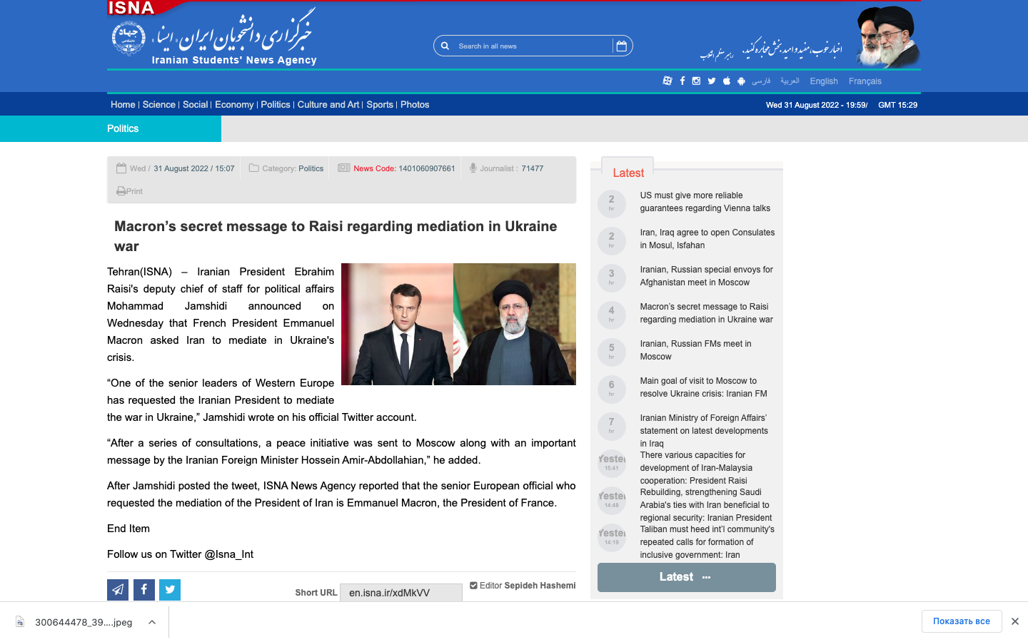 Заместитель главы администрации президента Ирана Мохаммад Джамшиди заявил, что "один из высокопоставленных лидеров Западной Европы обратился к президенту Ирана с просьбой выступить посредником в войне на Украине". Об этом Джамшиди написал в Twitter.