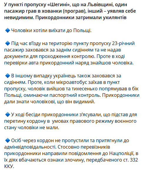 На пункте пропуска "Шегини" на границе с Польшей, двое мужчин предприняли отчаянную попытку покинуть страну. Один из них "играл в прятки", другой - "представлял себя невидимым".