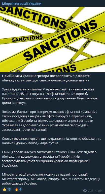Правительство поддержало инициативу Минреинтеграции и одобрило новый пакет санкций. Он касается 99 физических и 178 юрлиц.
