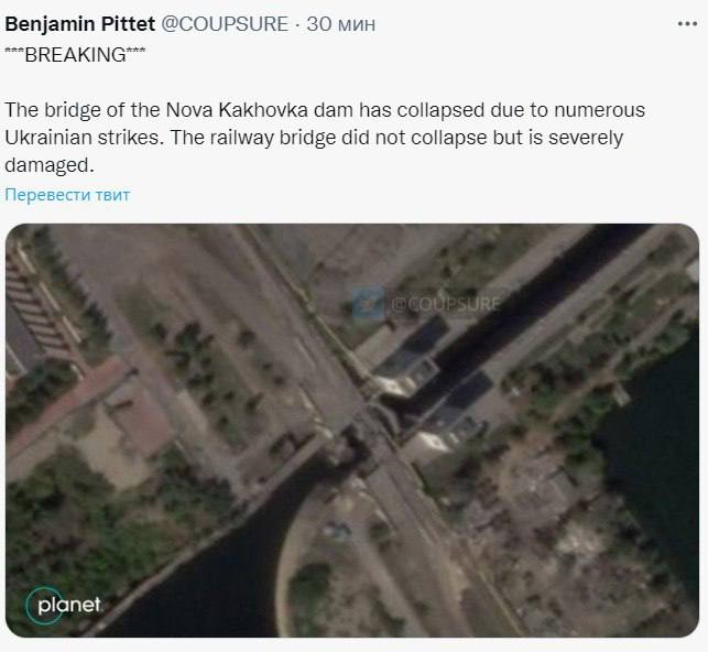 "Мост Новокаховской плотины обрушился из-за многочисленных украинских ударов. Железнодорожный мост не обрушился, но сильно поврежден", – написал он.