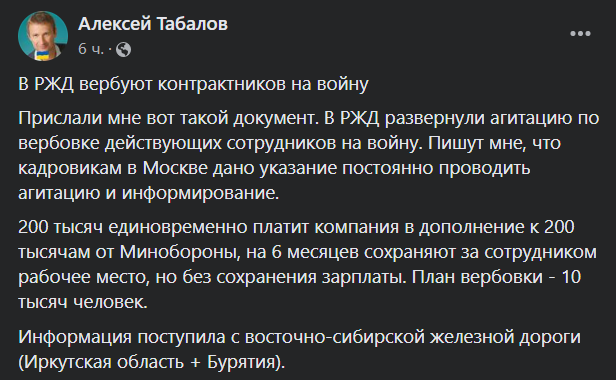 Отметим, о том, что РЖД получили разнарядку на поиск среди гражданских работников до 10 тыс. новых кандидатов на краткосрочный контракт", в вечерней сводке сообщал Генштаб ВСУ.