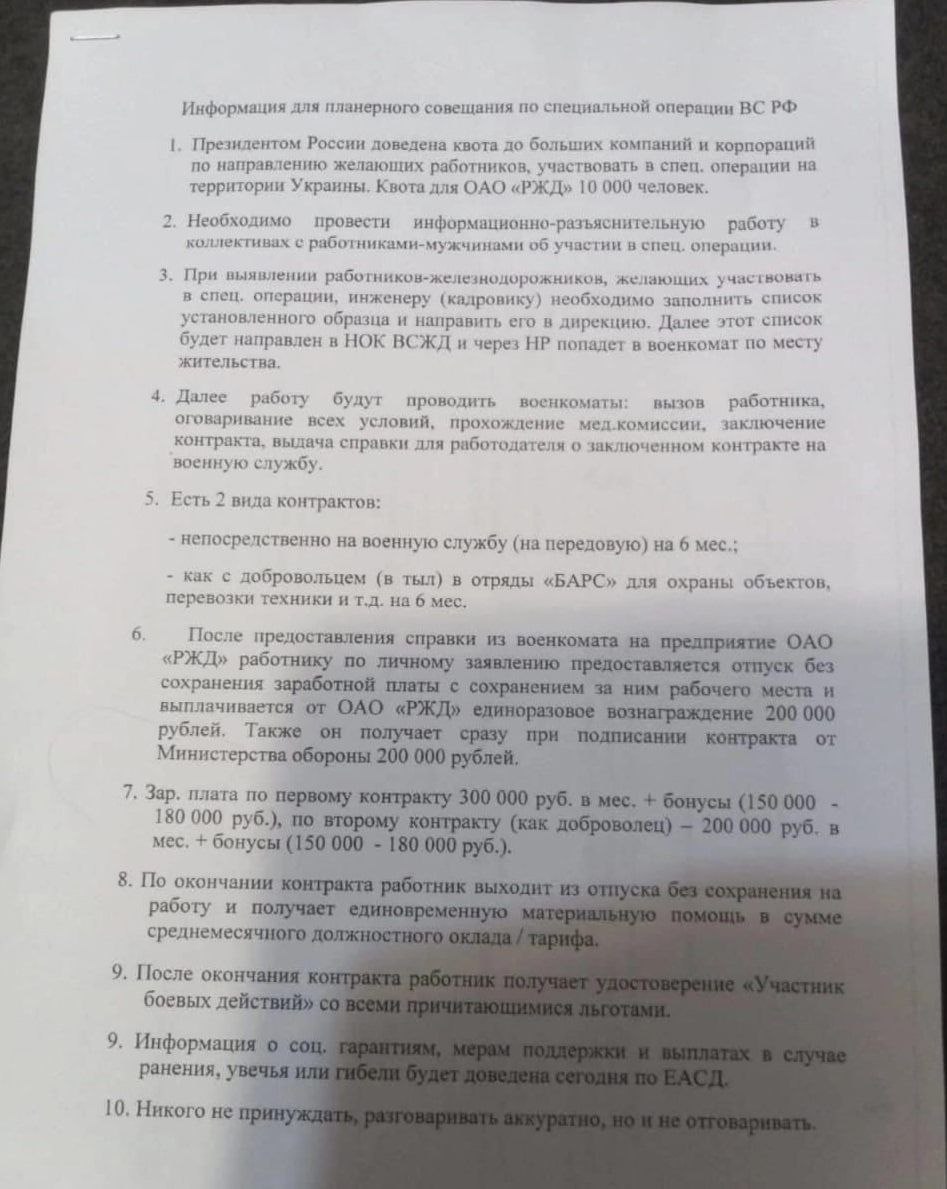 В нем указано, что представителей РЖД должны с сотрудниками "информационно-разъяснительную работу" об участии в войне, а если среди них будут желающие - направить в военкоматы список с их данными. После этого железнодорожников вызовут для заключения контракта.