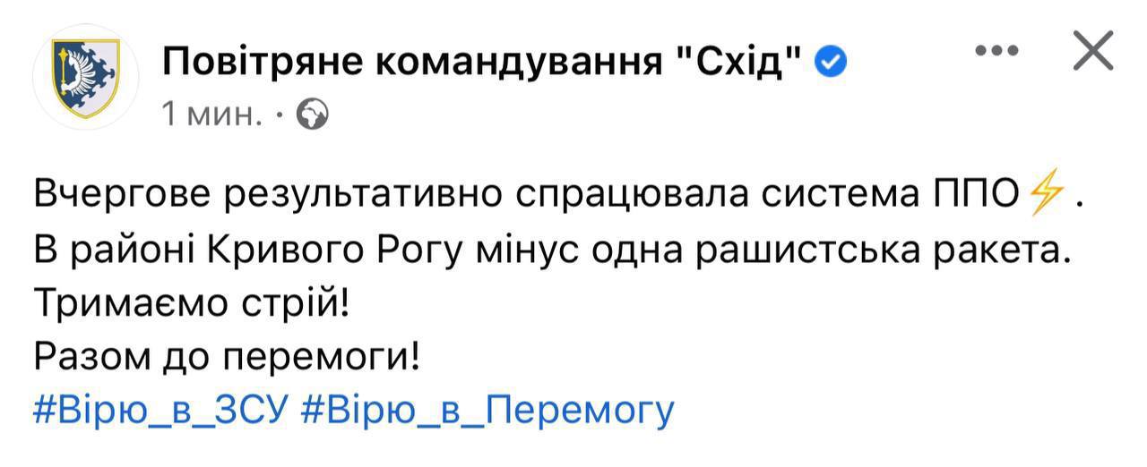 11.00 В районе Кривого Рога сбита очередная российская ракета, сообщает воздушное командование "Восток".