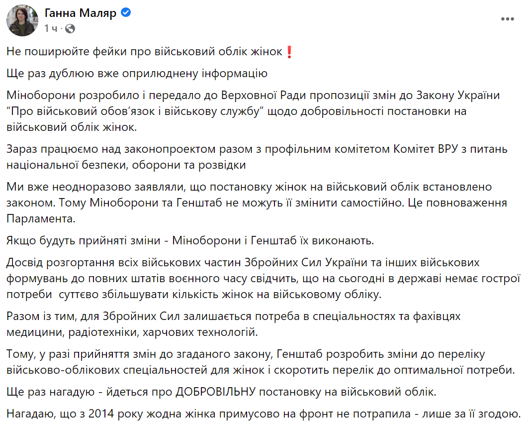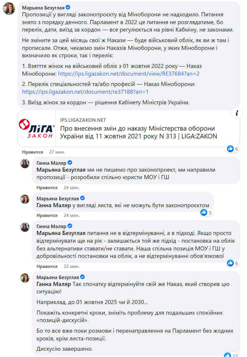В то же время отметим, что законопроект, о котором говорит Маляр, пока не принят Радой и, как выяснилось из дискуссии в комментариях к ее посту, даже Кабмином не подан (а обязанность у женщин вставать на воинский учёт появится уже с 1 октября).