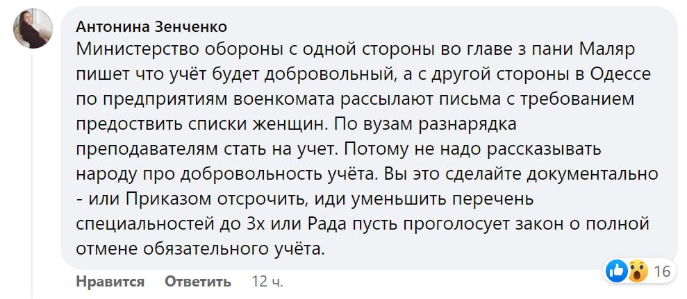 "Министерство обороны с одной стороны во главе з пани Маляр пишет, что учёт будет добровольный, а с другой стороны в Одессе по предприятиям военкомата рассылают письма с требованием предоставить списки женщин. По вузам разнарядка преподавателям стать на учет. Потому не надо рассказывать народу про добровольность учёта. Вы это сделайте документально - или приказом отсрочить, иди уменьшить перечень специальностей до 3-х, или Рада пусть проголосует закон о полной отмене обязательного учёта", - считает Антонина Зенченко из Одессы.