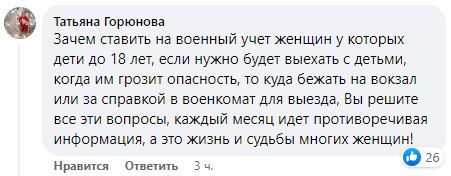 "Зачем ставить на военный учет женщин у которых дети до 18 лет, если нужно будет выехать с детьми, когда им грозит опасность, то куда бежать на вокзал или за справкой в военкомат для выезда. Вы решите все эти вопросы, каждый месяц идет противоречивая информация, а это жизнь и судьбы многих женщин!" - пишет Татьяна Горюнова из Днепра.