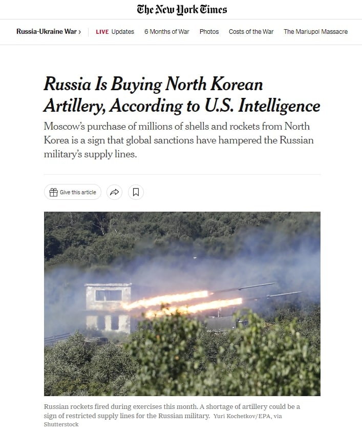 09.17 Россия покупает северокорейскую артиллерию, пишет со ссылкой на разведку США The New York Times.