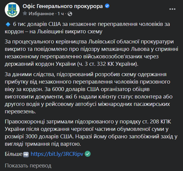 Подозреваемый был задержан после получения 3000 долларов. Ему сообщили о подозрении в содействии незаконной переправке военнообязанных через госграницу (ч. 3 ст. 332 УК Украины). Мера пресечения – содержание под стражей.