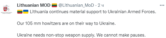 "Литва продолжает оказывать материальную поддержку Вооруженным силам Украины. Наши 105-мм гаубицы едут в Украину. Украине нужны непрерывные поставки оружия. Мы не можем делать паузы", - пишет пресс-служба Министерства обороны Литвы.