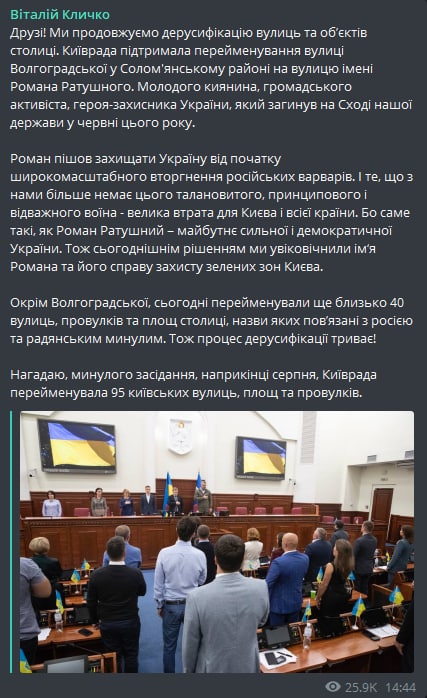 Киевсовет 8 сентября поддержал переименование улицы Волгоградской в Соломенском районе столицы в улицу имени Романа Ратушного.