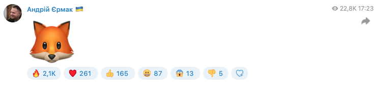 В то же время глава Офиса президента Андрей Ермак продолжил публиковать у себя в телеграме многозначительные эмодзи. На этот раз он без всяких объяснений показал изображение лисы. Что, видимо, обозначает Лисичанск.
