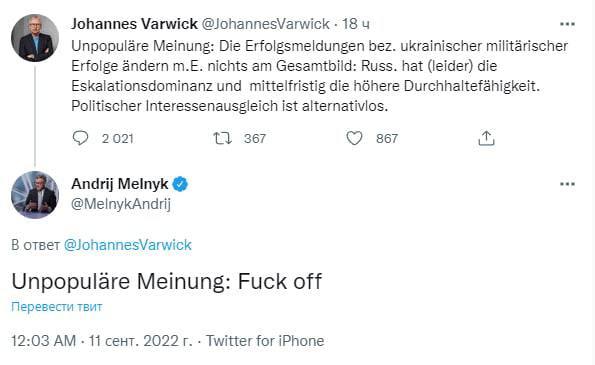 Уходящий вскоре в отставку посол Украины в Германии Андрей Мельник резко отреагировал на заявление немецкого политолога Йоханнеса Варвика по поводу преимущества России в войне с Украиной.