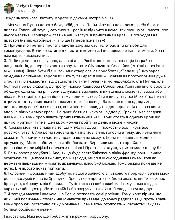 Советник главы МВД Вадим Денисенко у себя в Facebook рассуждает о том, какие настроения доминируют в обществе и элитах РФ на фоне успешного контрнаступления ВСУ в Харьковской области, а также прогнозирует его последствия.