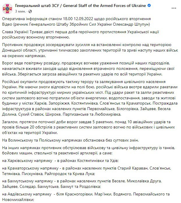 07:15 Сводка украинского Генштаба на утро 12 сентября.