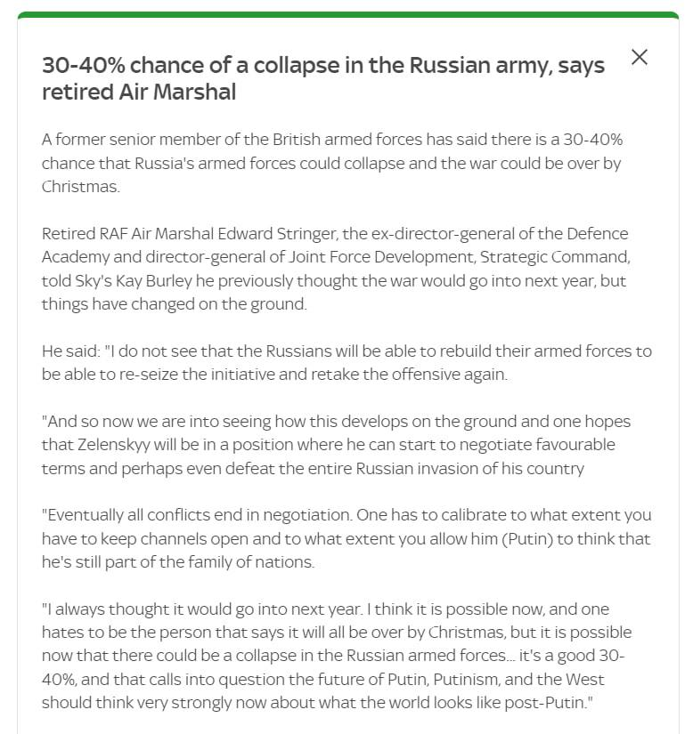 "Я всегда думал, что это произойдет в следующем году. Я думаю, что это возможно сейчас, и не хочется быть человеком, который говорит, что все закончится к Рождеству, но это возможно сейчас, что в российских вооруженных силах может быть коллапс... это добрые 30-40% вероятности и это ставит под сомнение будущее Путина, и Запад должен очень серьезно задуматься сейчас о том, как будет выглядеть мир после Путина", - сказал Стрингер.