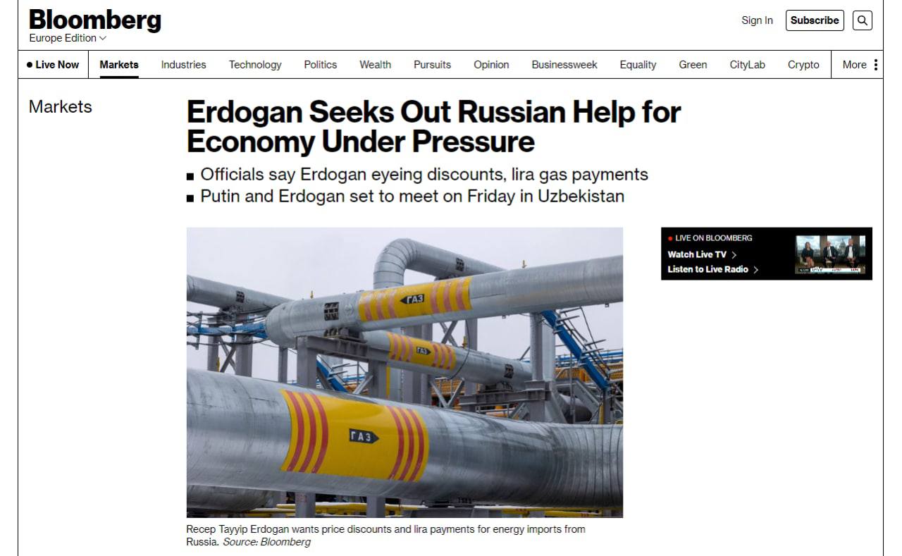 Эрдоган хочет получить от Путина скидку на газ, чтобы стабилизировать экономику накануне выборов — Bloomberg