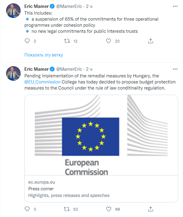 "В ожидании реализации мер по восстановлению верховенства закона в Венгрии коллегия Еврокомиссии предложила Совету ЕС принять меры по ограничению бюджета в рамках механизма обусловленности выплат соблюдением верховенства закона", - формулировал Мамер.