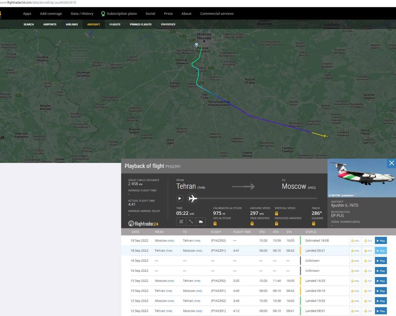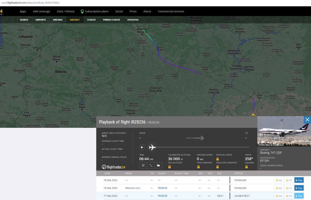 По данным сайта Flightradar24.com, отслеживающего полеты по всему миру, из Тегерана в столицу РФ прибыли за эти дни минимум 4 борта авиакомпаний, связанным с иранскими военными.