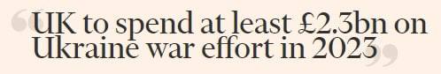 10:35 Британия намерена выделить Украине в качестве военной помощи в следующем году не меньше 2,3 миллиарда фунтов стерлингов (около 2,6 млрд долларов), пишет газета Financial Times.