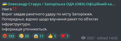 08:22 Власти Запорожья подтвердили вчерашний удар по городу.