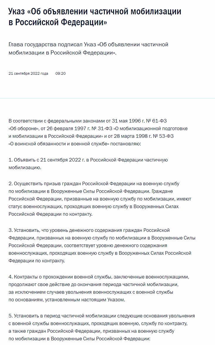 На сайте Кремля уже появился полный текст указа Путина о частичной мобилизации в России.