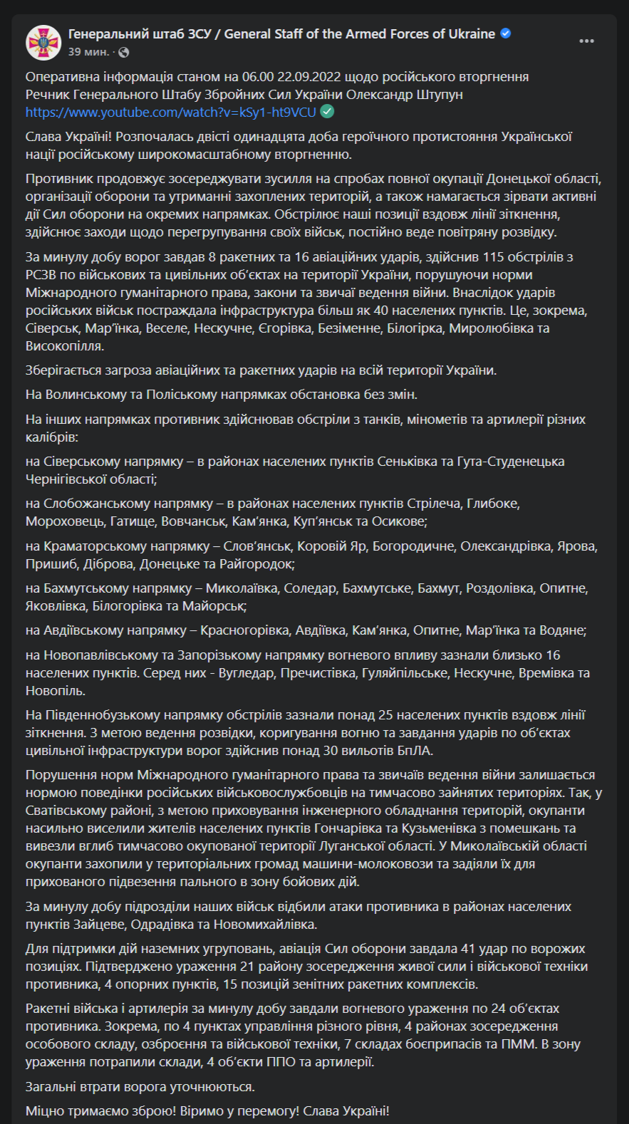 В четверг, 22 сентября, идет 211-й день полномасштабного российского вторжения в Украину.