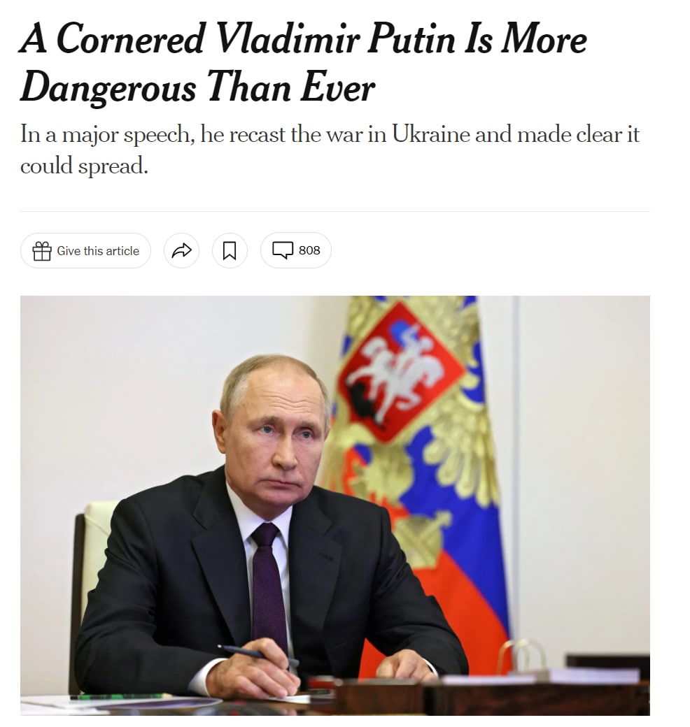 Попытка ослабить или победить Россию может спровоцировать ядерный катаклизм. Такой мессидж посылает Путин Западу, говорится в аналитической The New York Times "Загнанный в угол Владимир Путин опаснее, чем когда-либо".
