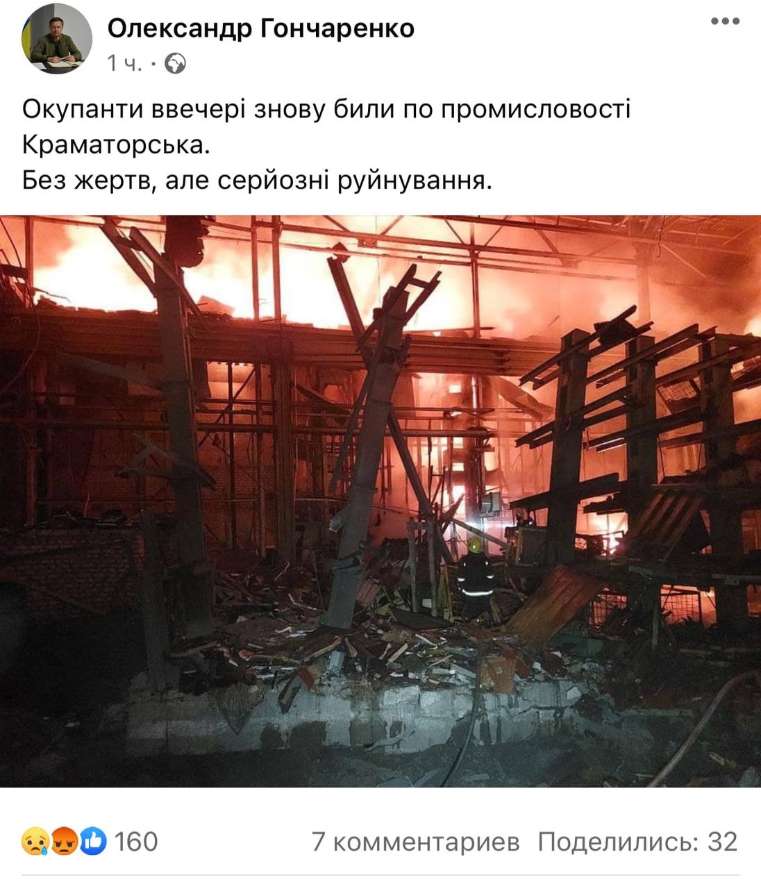 "Пострадавших нет, но предприятие серьезно разрушено", — написал он.
