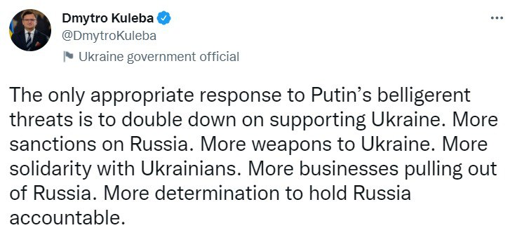 Больше солидарности с украинцами. Все больше предприятий должны уйти из России. Больше решимости привлечь Россию к ответственности", – заявил Кулеба.