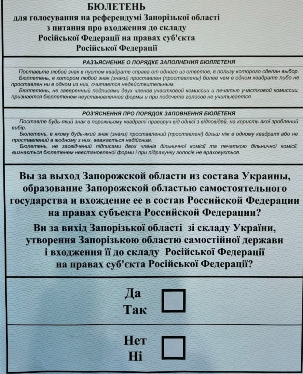 Вопросы в бюллетенях будут разные. У жителей Херсонской и Запорожской областей (точнее, их оккупированных районов), спросят, хотят ли они создать "независимое государство" и после этого стать частью РФ.