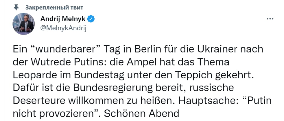 "Чудесный" день в Берлине для украинцев после гневной речи Путина: светофор (название правящей коалиции в Германии - Ред.) замел тему леопардов под ковер в Бундестаге. Взамен федеральное правительство готово принять русских дезертиров (имеется в виду решение МВД ФРГ принимать россиян, бегущих от мобилизации - Ред.). Главное: "Не провоцируйте Путина". Хорошего вечера", - написал Мельник в Твиттере.