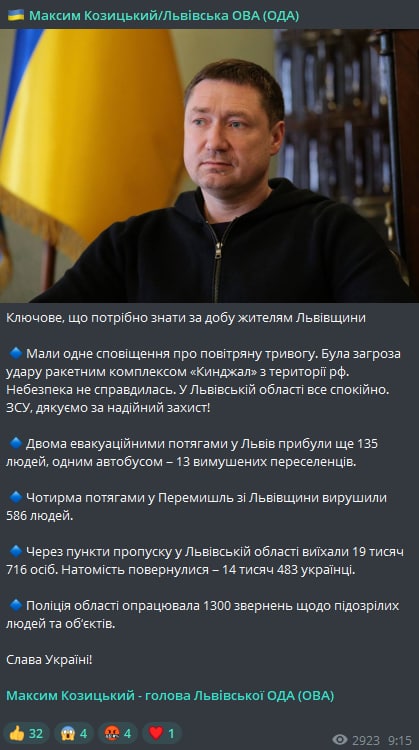 09:24 Львовские власти заявляют, что вчерашняя воздушная тревога (она звучала во Львове лишь 1 раз - с 11:47 по 12:16) была связана с угрозой удара российским "Кинжалом".